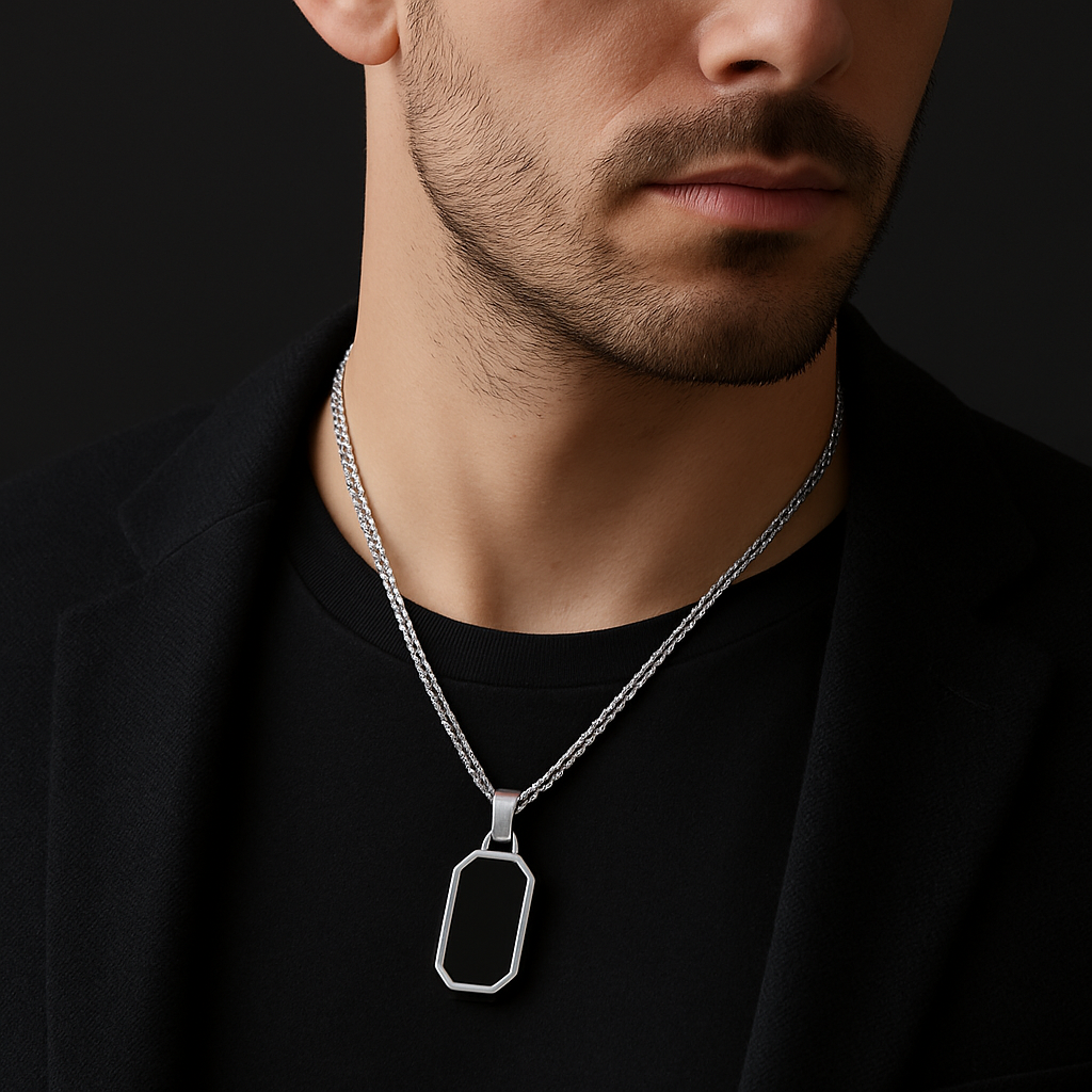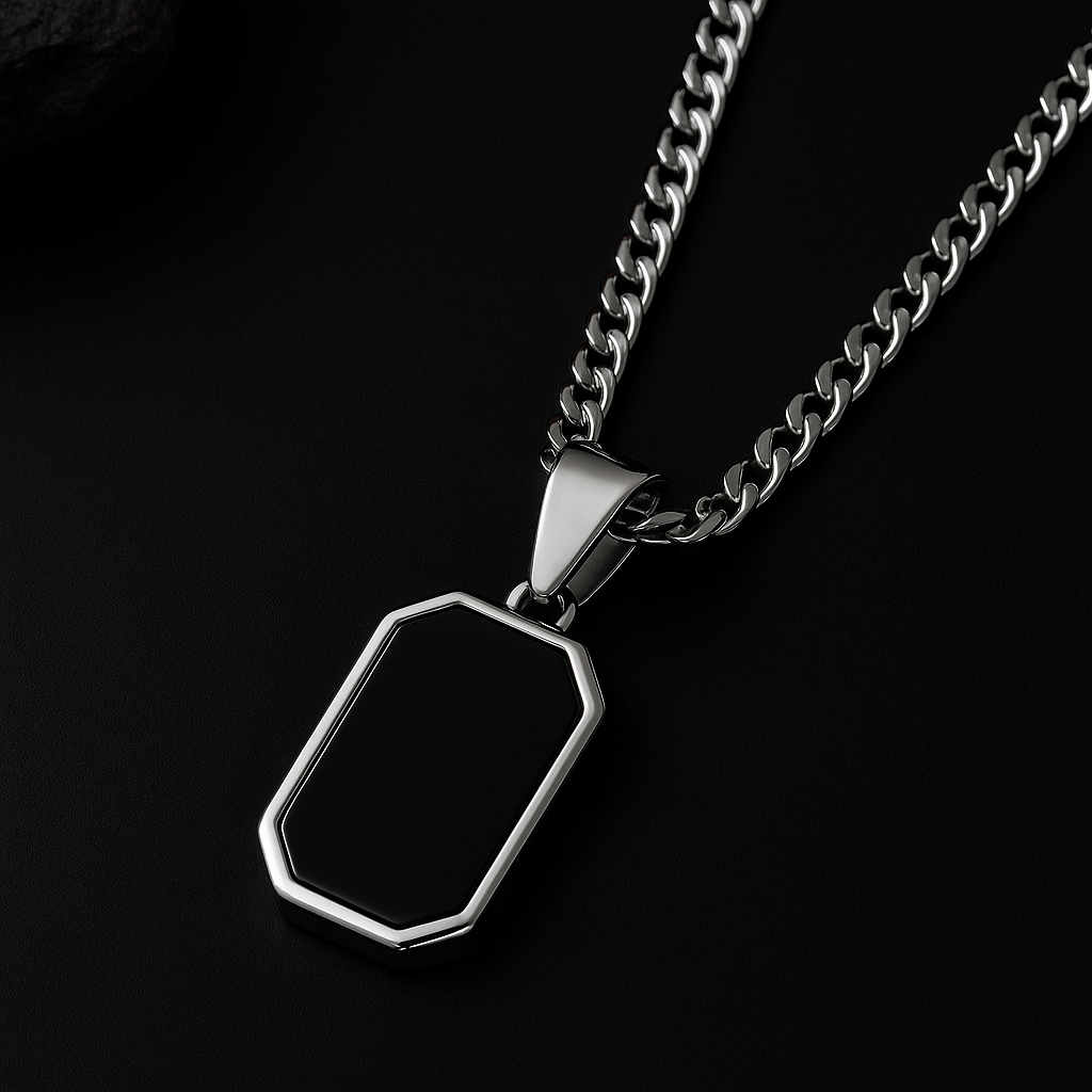 The Nova Pendant captures modern strength through minimalist design. Its black inlay set within a polished stainless steel frame embodies balance—between power and precision, simplicity and sophistication. Worn with confidence, it serves as a symbol of clarity and control in an ever-changing world.