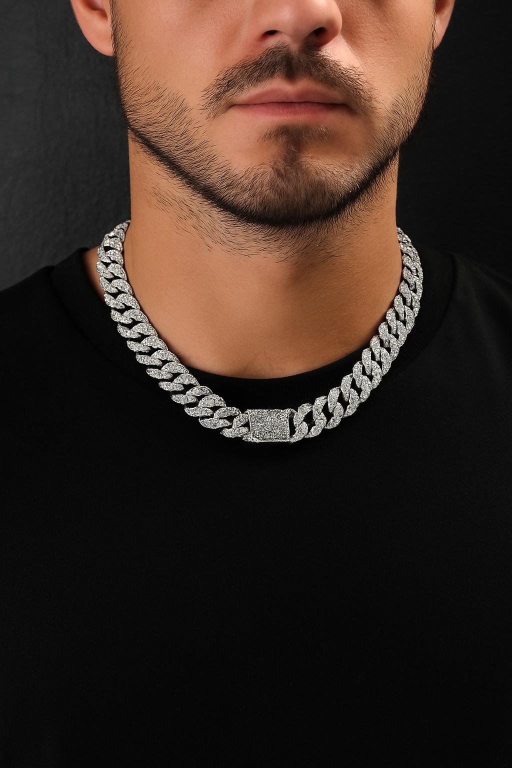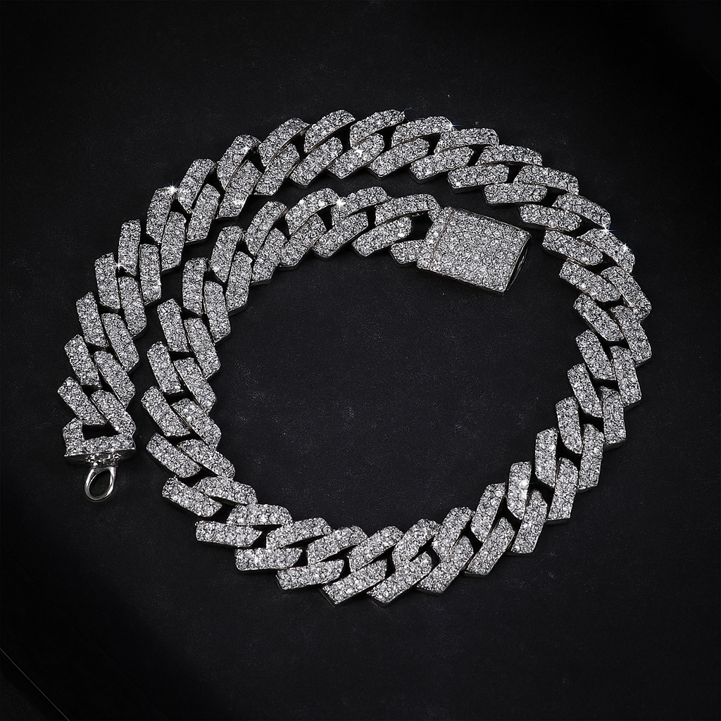The Frostbound Cuban Chain commands attention with every glint. Its bold, icy links are encrusted with high-shine rhinestones that catch the light—and every eye in the room. With a confident weight and undeniable presence, this chain isn’t made to blend in—it’s built to lead.