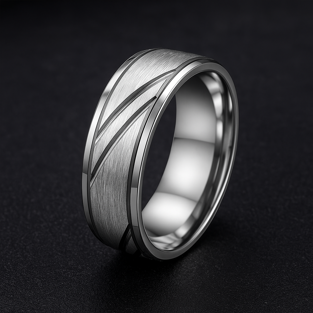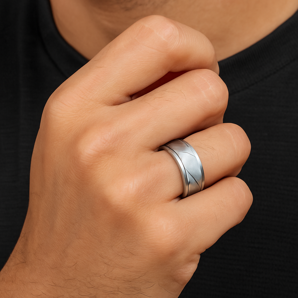 The Vanguard Ring embodies purpose and precision with every line. Featuring sharp, intersecting cuts across a brushed steel surface, this band delivers both modern minimalism and undeniable edge. Its weight feels substantial, while the polished bevels bring a sleek contrast to its textured design.